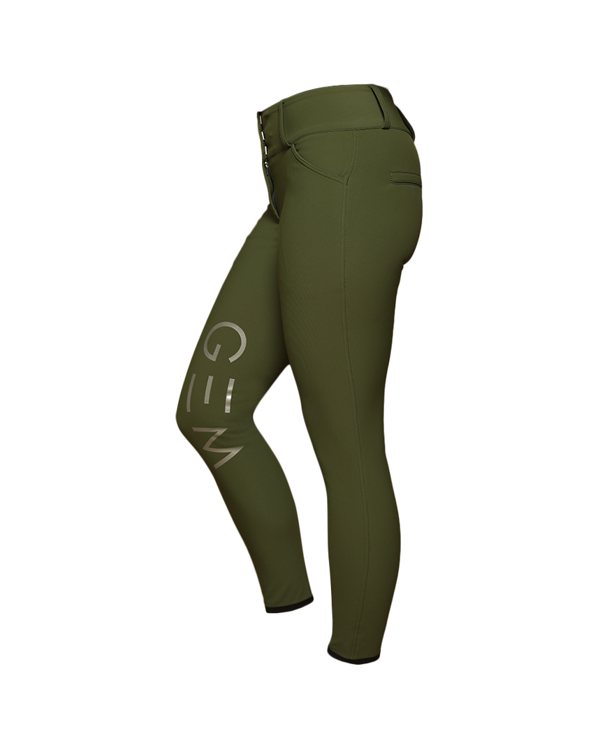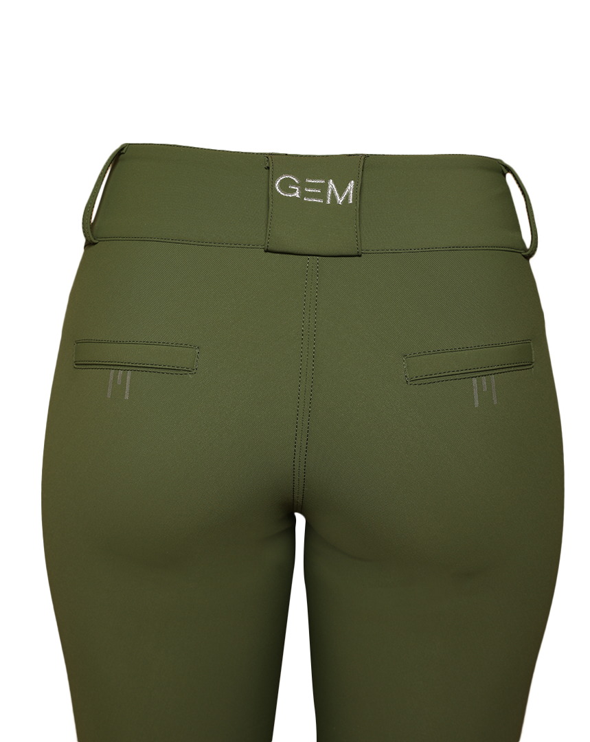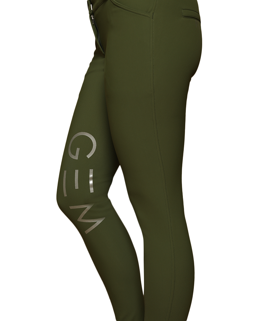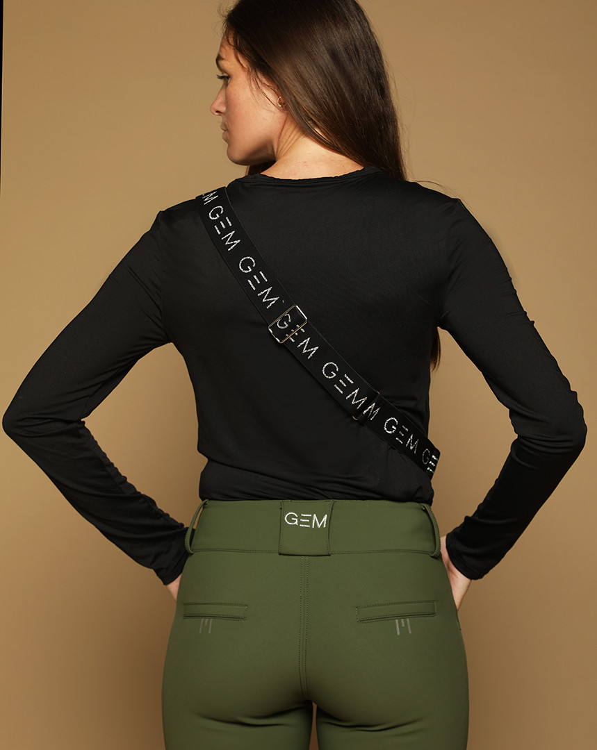 Grips GEM silver à l’intérieur des genoux, E de GEM sur chaque fesse, logo sur le passant arrière de la ceinture.