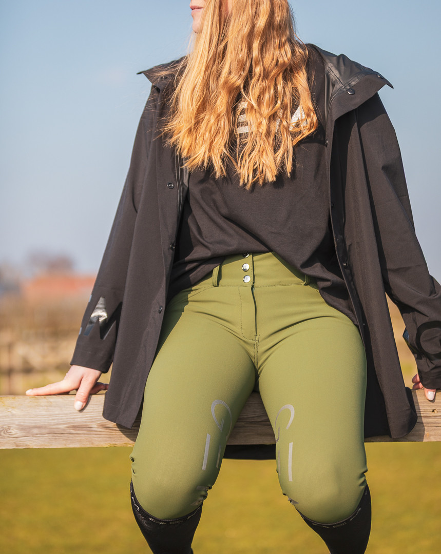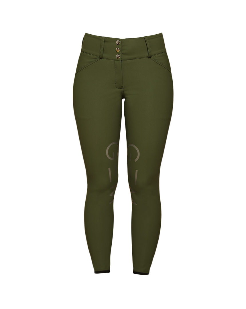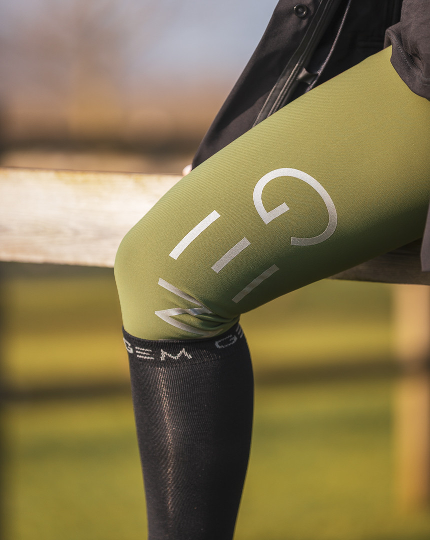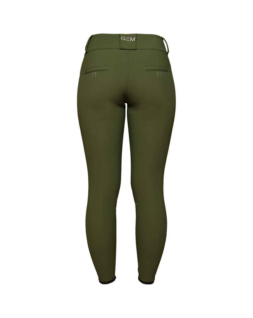 Grips GEM silver à l’intérieur des genoux, E de GEM sur chaque fesse, logo sur le passant arrière de la ceinture.