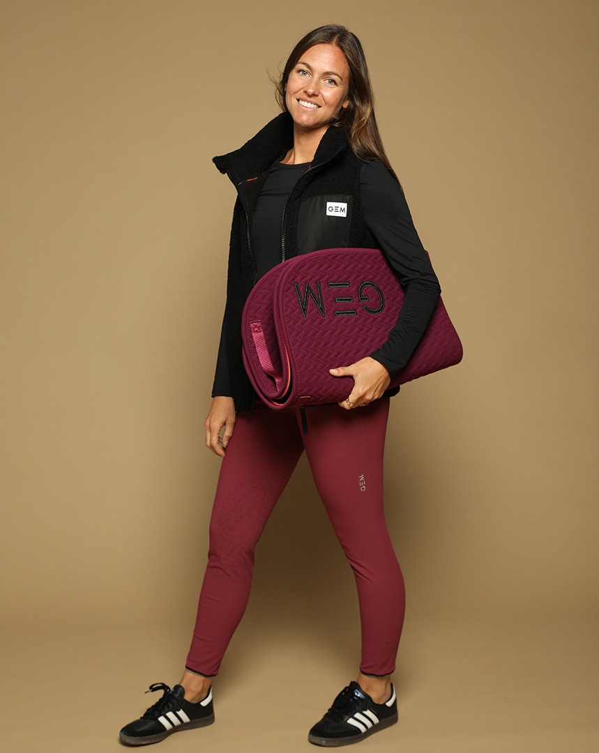 On craque pour les logos GEM pailletés aux fesses. Ses grips aux genoux permettent une meilleure fixité à cheval.