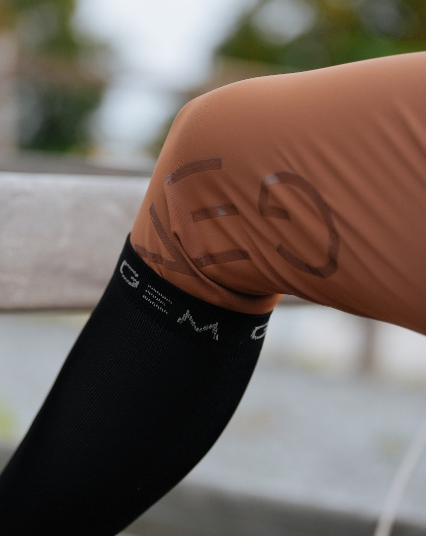 Un pantalon technique, aux lignes sobres et épurées, avec des grips aux genoux pour assurer une meilleure fixité à cheval.